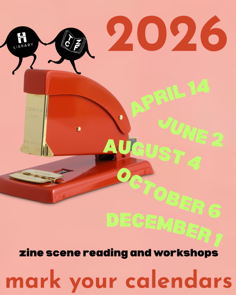 The Twin Cities Zine Fest doesn’t rest! We’re happy to partner with Hennepin County Library to present a series of Zine Scene, our every-other-month zinester reading. At every Zine Scene, you can expect to mingle with other zinesters (and optionally trade your own zines), hear from a variety of zinesters reading their most recent work, and take part in a workshop led by a local creator. We cannot require masks in the space, but they are heavily recommended and will be provided. The space is wheelchair accessible. They usually run from 5:30 pm-8 pm.